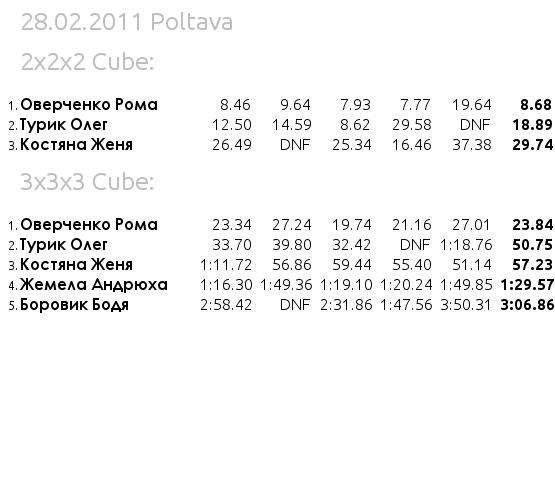 Швидкубінг в Полтаві поняття нове і мало кому відоме. Але є і в нашому місті любителі кубика Рубіка. Тому 27 лютого вперше в історії Полтавщини відбулася зустріч любителів цього інтелектуального спорту. Зустріч проводилася ввечері, в одному із торгово-розважальних центрів. На зустріч прийшло 7 чоловік, серед яких були не лише хлопці;). Учасниками даної події були: Оверченко Роман, Турик Олег, Жемела Андрій, Боровик Богдан, Паламарчук Сергій, Хоменко Славік і Костяна Євгенія (перший швидкубер-дівчина в Полтаві і це круто). Незважаючи на невелику кількість учасників відчувалась атмосфера дружньої конкуренції. Збирали багато різних головоломок, але для заліку винесли лише 2х2х2 і 3х3х3.